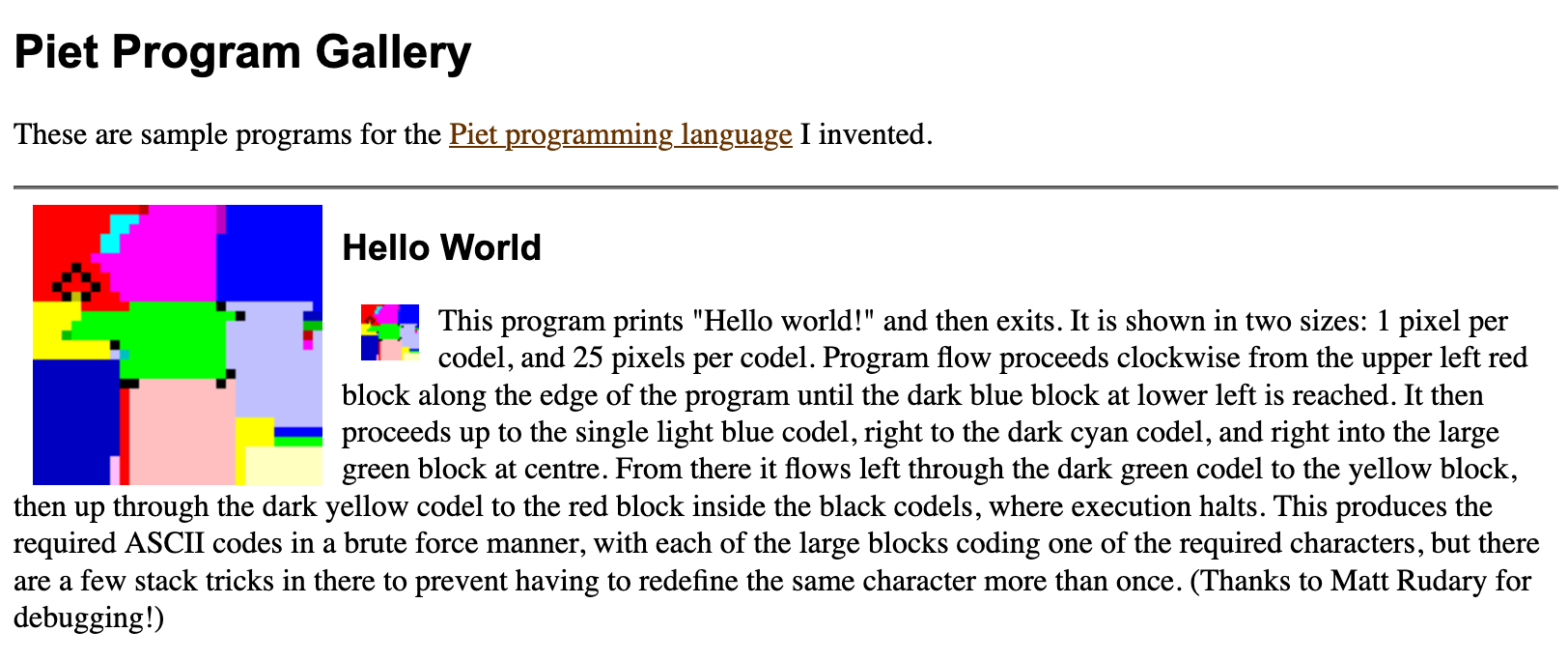 If you want to learn more about David Morgan, the origin story of the Piet programming language, and some of his perspectives on eso-langs in general, you'll want to check out this interview from 2015 on Esoteric Codes: