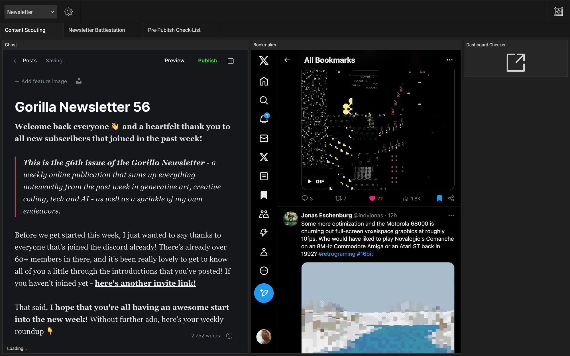 I gave Freeter a shot and it actually does make a lot of sense, it's in essence a tool that lets you containerize workflows, for instance when I'm collecting the content for the blog I will often switch between the Ghost editor and my Twitter bookmarks, with Freeter I can save these two views as a workflow: