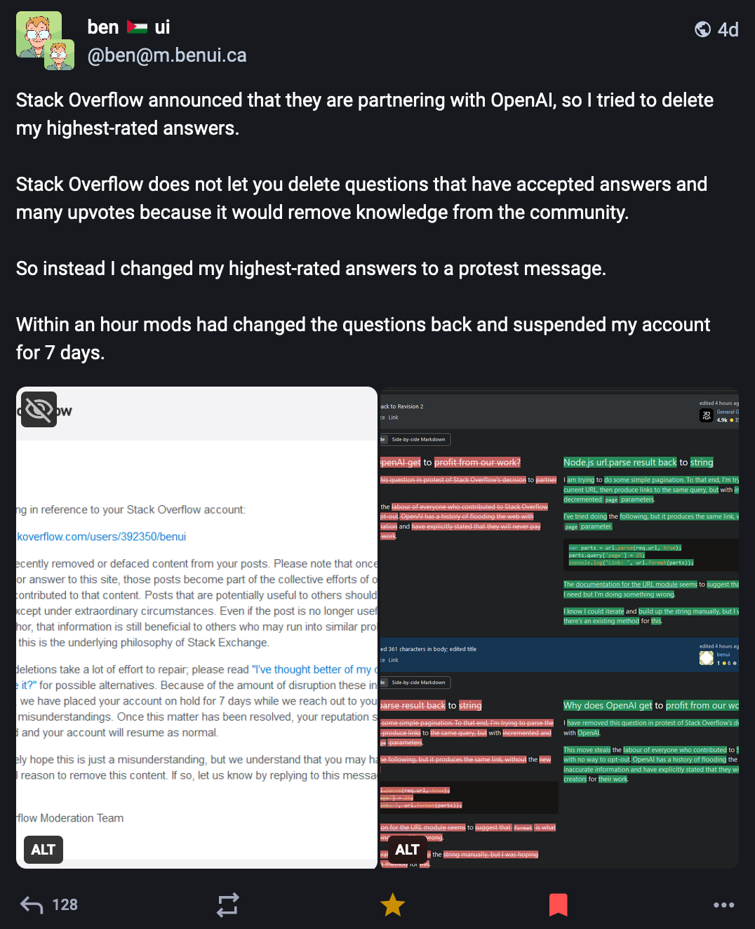 The big issue that emerges from this partnership that caused quite a bit of outrage amongst the SO contributor community is that SO is simply handing out its own user data to the AI giant. Does SO actually have the rights to the exchanges that have transpired on the platform? In light of this a digital protest quickly took shape in response to the announcement: many SO contributors that were displeased with the thought of aiding the training of OpenAIs proprietary LLMs, attempted the deletion of their posts. SO does not however allow this when it comes to highly upvoted questions and answers: