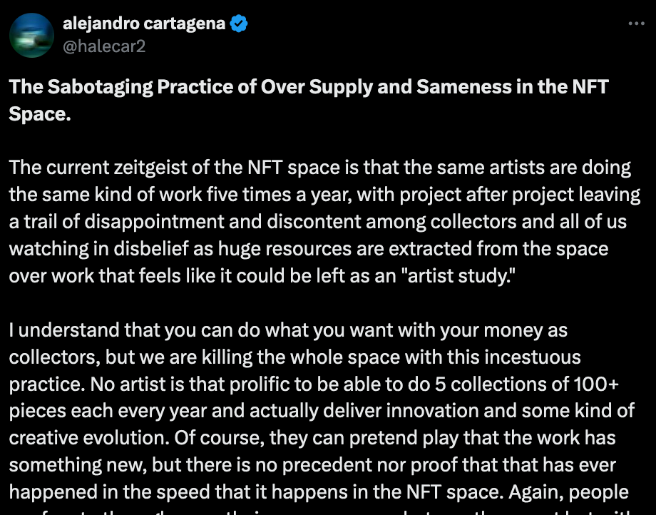 The catalyst to it all was this Tweet by Alejandro Cartagena titled The Sabotaging Practice of Over Supply and Sameness in the NFT Space: