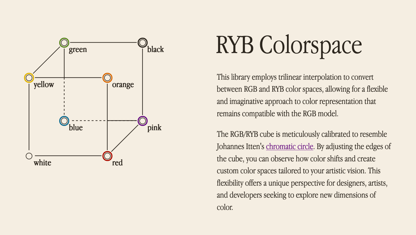 David Aerne is a software dev, creative coder, generative artist with a big passion for colors - most of his time you'll find him diligently building tools for the purpose of manipulating colors in all sorts of different ways; from their nomenclature, to palette configuration and other related tasks. David recently announced his newest creation titled RYBitten - a little library that lets you generate color spectrums according to Johannes Itten's color wheel theory: