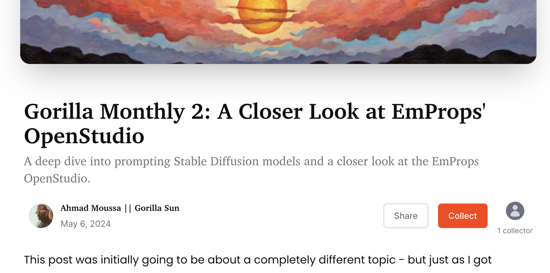 After publishing the Newsletter last Monday, I doubled down and wrapped up the second Gorilla Monthly in which I ended up doing a big deep dive on the EmProps OpenStudio that I recently got access to - a big examination of how to prompt Stable Diffusion models and how the different parts of the OpenStudio play into this - you can get access to the article by subscribing to my Hypersub here: