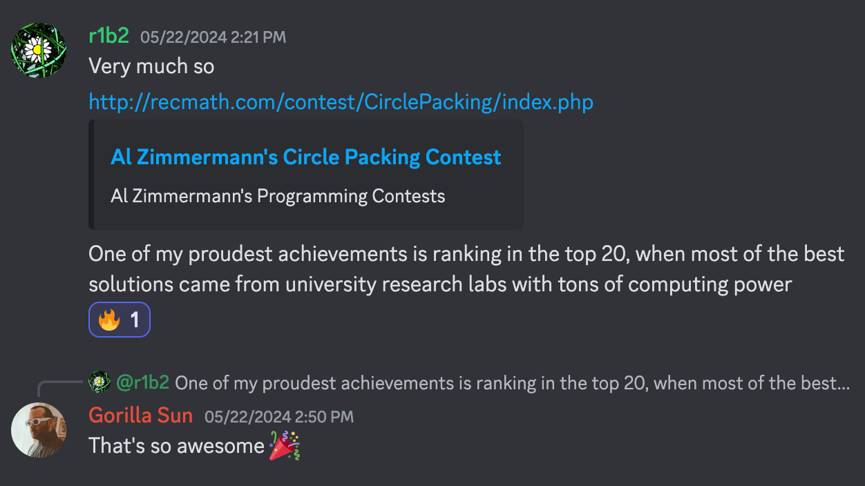 We've actually chatted quite about packing things over in the discord, r1b2 shared a really cool personal story that dates back to 2006 where he placed in the top 20 for a programming contest that revolved around circle packing. What makes this ranking special is that he was competing on his own against research labs: