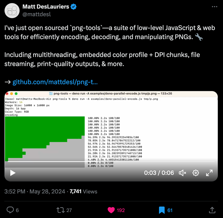 Matt DesLauriers' been up to quite a few shenanigans over on Twitter, posting about his efforts in building a png encoder and decoder - just a few days ago he's released some of the tools in form of an open source repository on Github - here's Matt's tweet:
