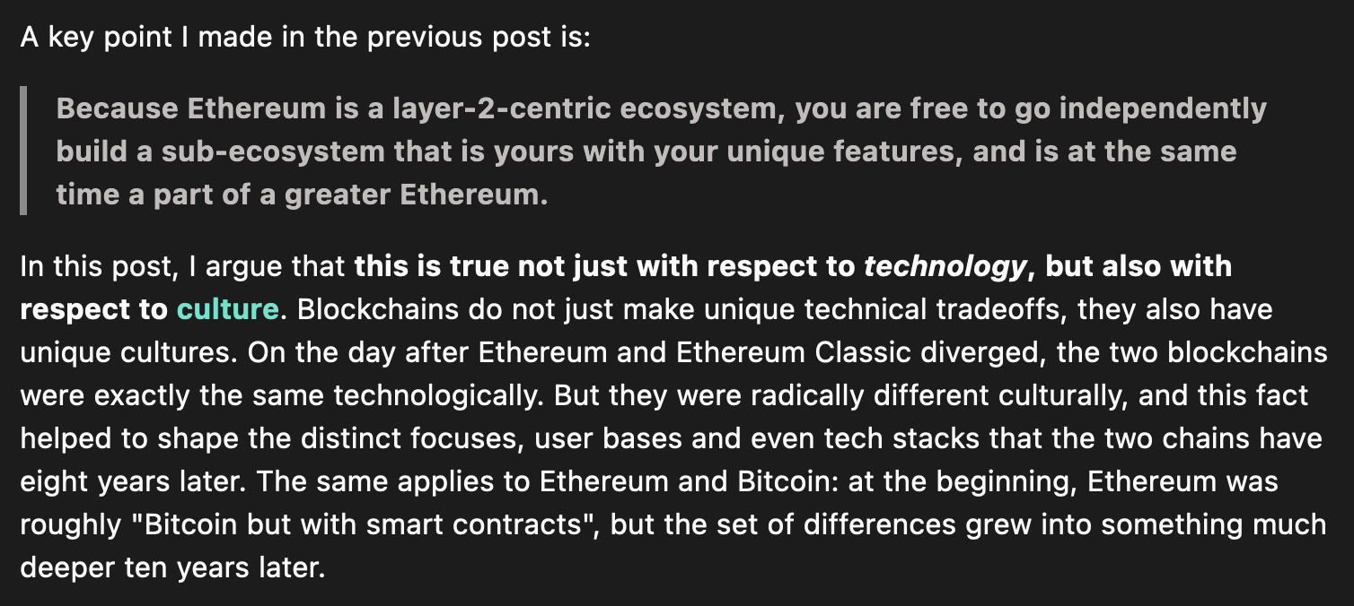 The creator of Ethereum Vitalik Buterin wrote an interesting article about the emergent cultural aspects of Layer 2s and different blockchains, they're not simply technological innovations, but also form their own unique communities around them, and is reminiscent of how different online communities have had their own distinct vibes and values over the years.: