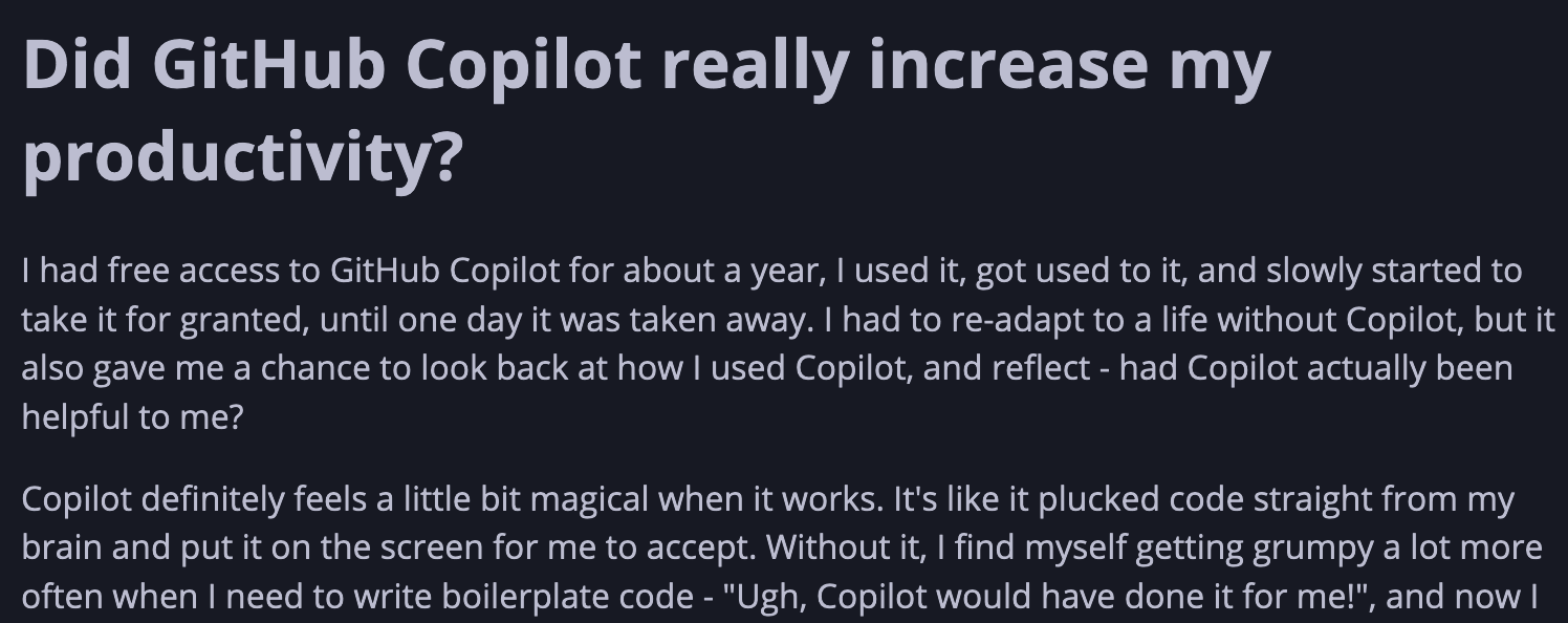 Yuxuan Shui wrote an article in which he reflects on his experience with Copilot, that he's mainly used for the purposes of developing his own personal project. He ultimately comes to the conclusion that he's more productive without the smart coding assistant, mainly due to the unpredictability of it: