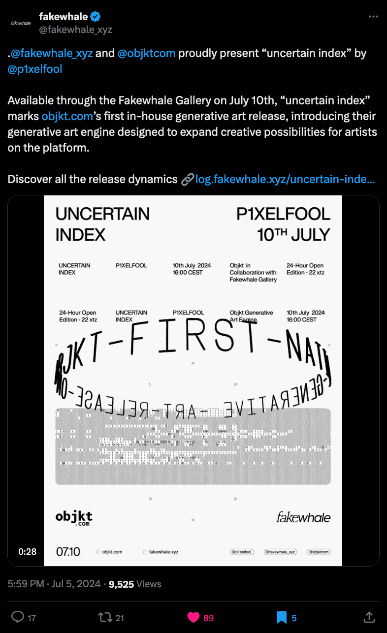 The biggest news last week is arguably Objkt.com's announcement of native support for minting generative on their big marketplace platform. They're kicking the feature off as a collaboration with the curated media platform Fakewhale, and placing none other than PixelFool as the premier artist to publish a generative project with the new feature:
