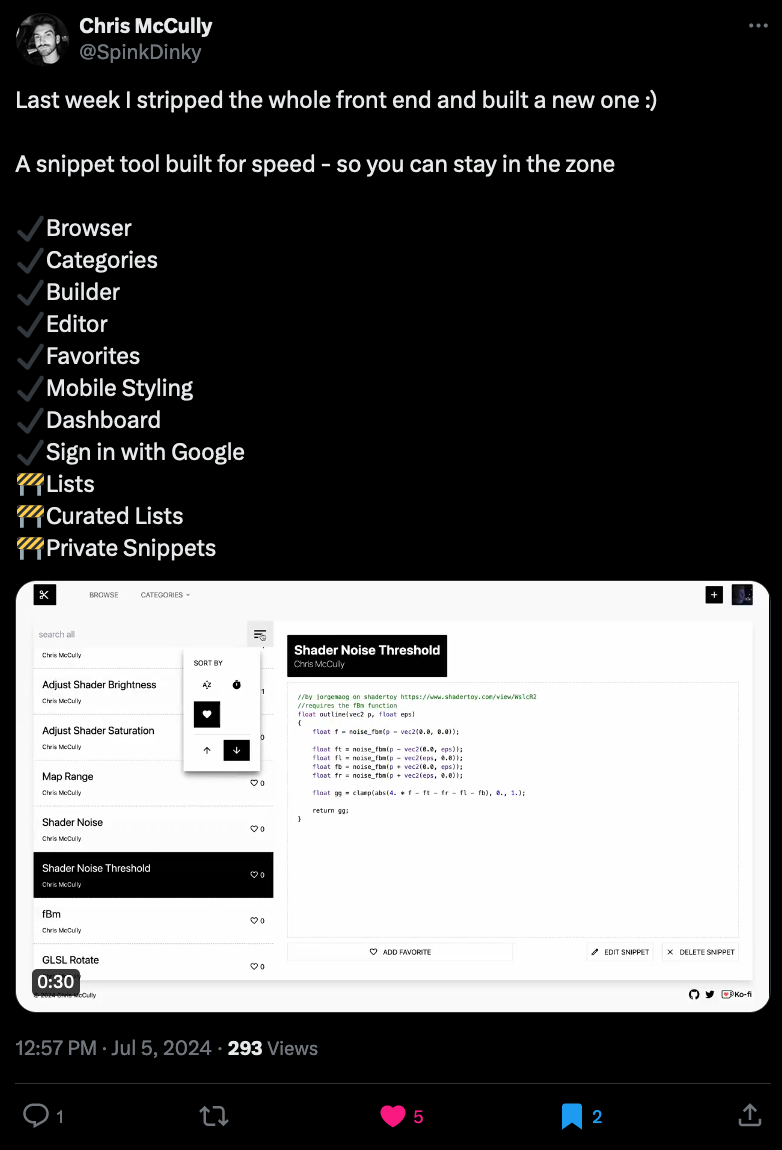 Back in January I shared a cool tool built by my fellow generative artist Chris McCully that's entirely geared around sharing and discovering useful snippets of code. He's recently made it public that he's been back at it and completely revamped the tool, now much improved with many additional features. If you want to explore some of the existing snippets, or add your own, you can check it out here: