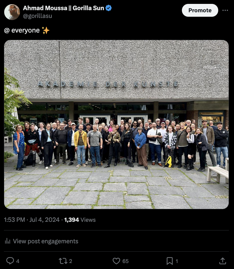Link to Tweet #1: Big Artist group shot taken in front of the Academy of Arts | Link to Tweet #2: The Auditorium in which the talks were held + a pic Haiver took at the Expanded.art opening the day before the conference + some of the swag that others were handing out | Link to Tweet #3: A selfie with Raph at the Creative Code Stammtish held ever first Friday of the month.