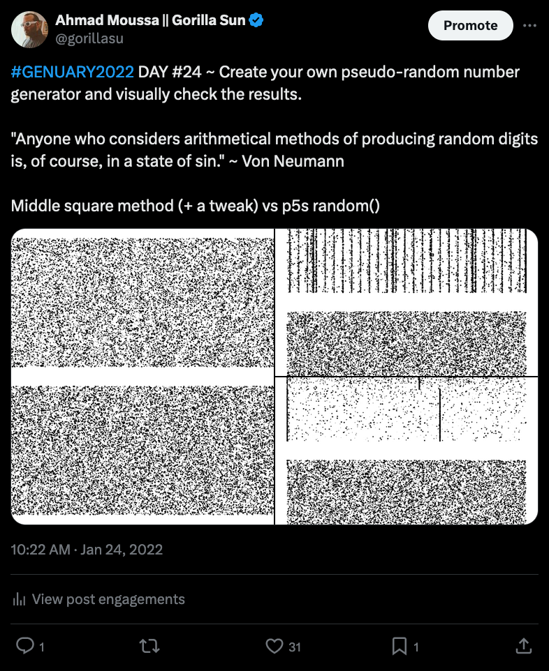 Ben's experiment indicates that the generated randomness is comparable, but it also feels cut short in a way - I wish he had explored things a bit further. This makes me wonder, what are actually some other ways are for comparing PRNGs? Ben's experiment reminds me of a sketch I did for the 24th prompt of Genuary in 2022, where the given prompt asked to create a PRNG from scratch - and I ended up finding the generated patterns quite fascinating: