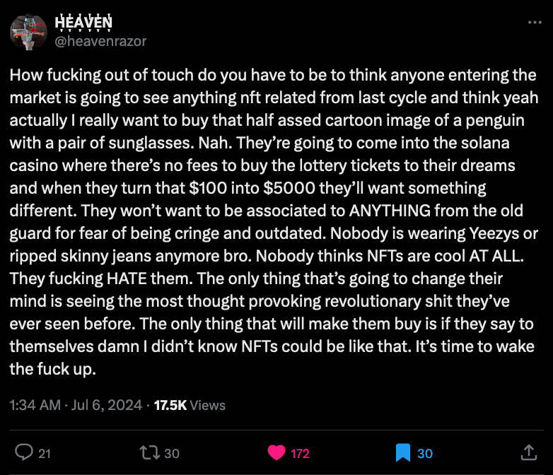But this particular discourse seems to be in a constant state of transience - the thing is, NFTs aren't dead, the hype is, and I think it's bothering people that this is the case. I do however fully agree that we need thought provoking revolutionary shit.