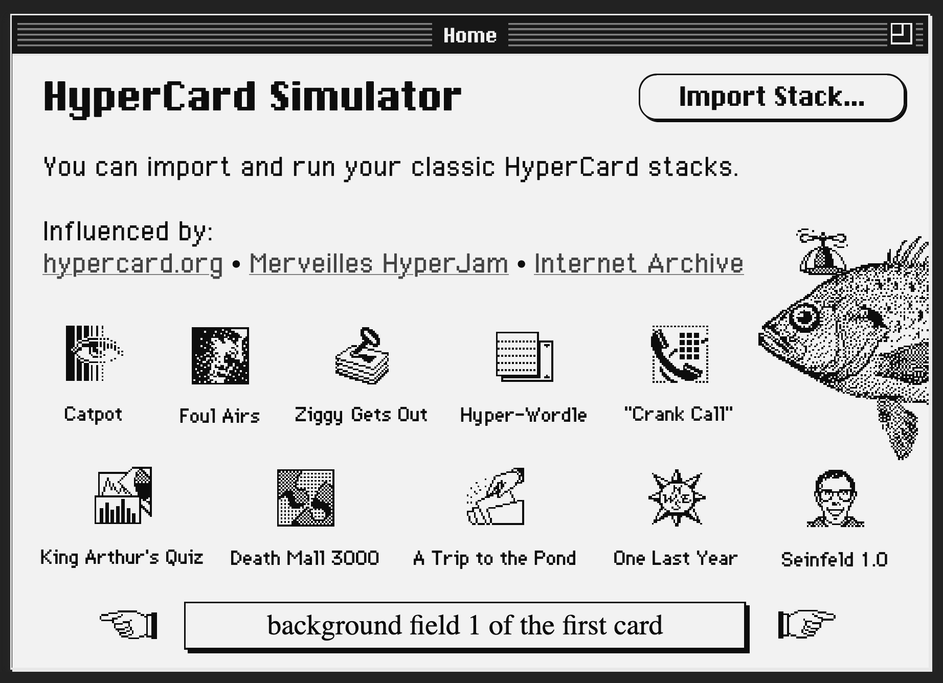 The Simulator is also already preloaded with a bunch of stacks that I had a load of fun exploring. In particularly I highly enjoed the minimal game "Foul Airs" which I think is conceptually simply a masterpiece. Looking a bit more into it I also found this article by Jen Thorp - a decade old at this point - where he writes a beautiful recount of the impact that the software has had on him: