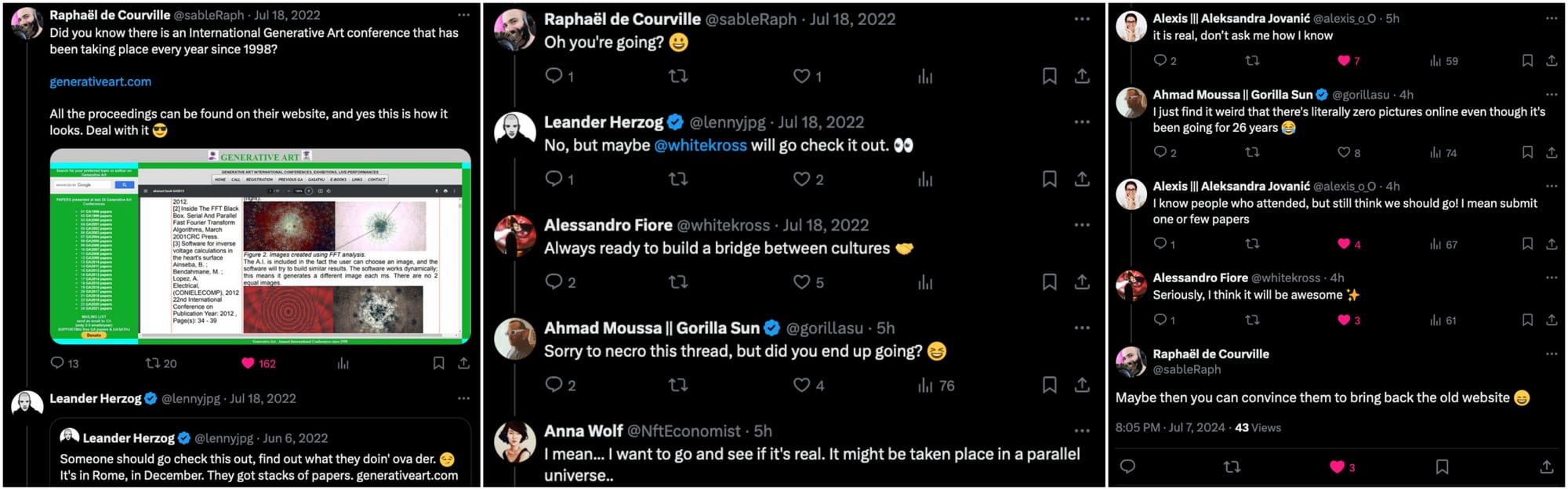 I'm not entirely certain about the vibe of the conference, but in comparison to the genart summit that happened last week in Berlin, it seems to be a much more traditional, academic style conference (something I was running away from when I first got into generative art). What I find a bit peculiar is that I can't seem to find any pictures of the conference, even though it's been ongoing for 26 years - in an exchange over on TwiX, Aleksandra does vouch however that the conference exists: