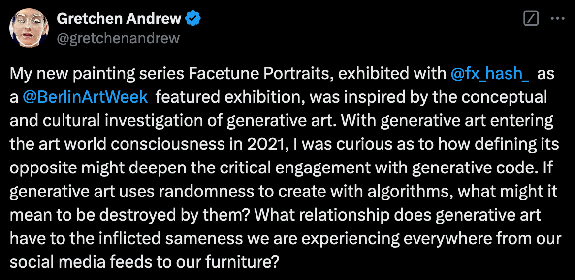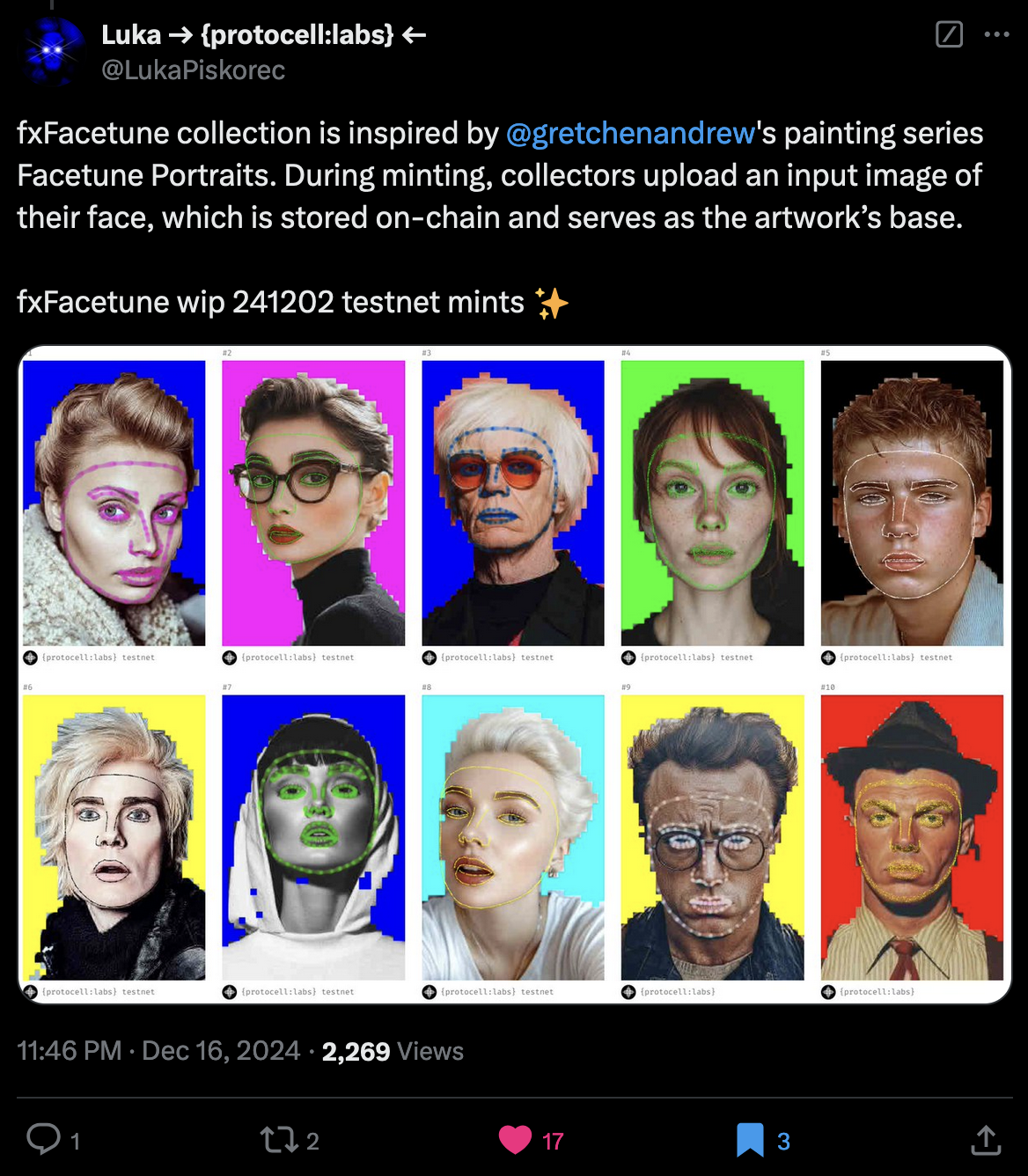 4 â Luka Piskorec's fxFacetune: every once in a while you come across a project that really blows you awayâthis past week I felt that way with Luka Piskorec's fxFacetune! It's a longform genart project on fxhash, that lets you turn a selfie of yours into a generative charicature stored directly on the blockchain. Not just the code that produces the artwork, but the image itself is stored onchainâand that's crazy impressive, because just storing a small amount of information onchain can quickly get pretty expensive. Luka sidesteps this however by leveraging a smart compression algorithm to bring the images down to a manageable size.