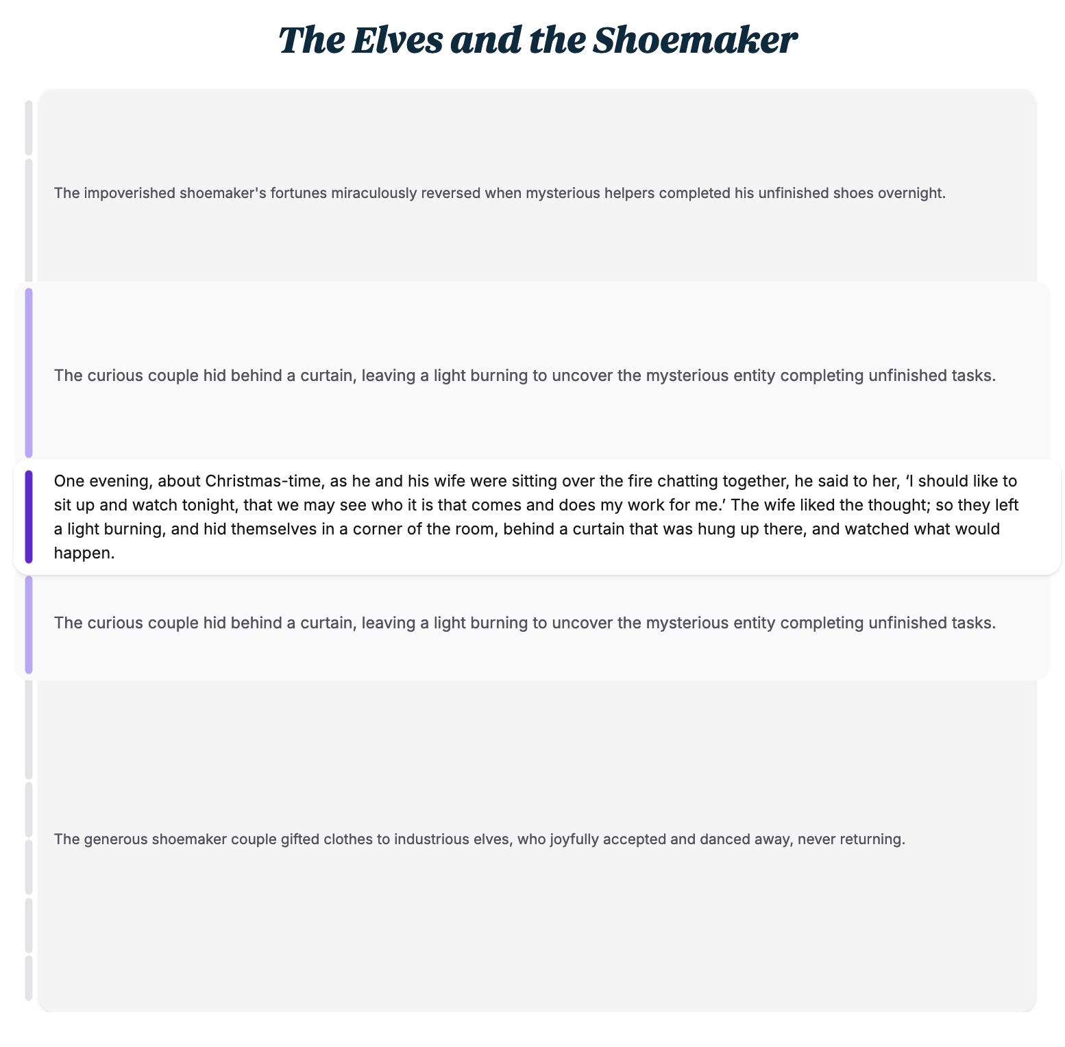 LLMs are really good a summarization, which can also be described as semantic compression. Often the same idea that's expressed over the span of a paragraph can also be conveyed through a single sentence. This is what Amelia leverages for her experiment: she presents a full text through an LLM powered fish-eye lens. Only the current portion that we're focused on is presented in full detail, whereas preceding and future passages are increasingly compressed the further away they are. Amelia demonstrates this with an interactive example:
