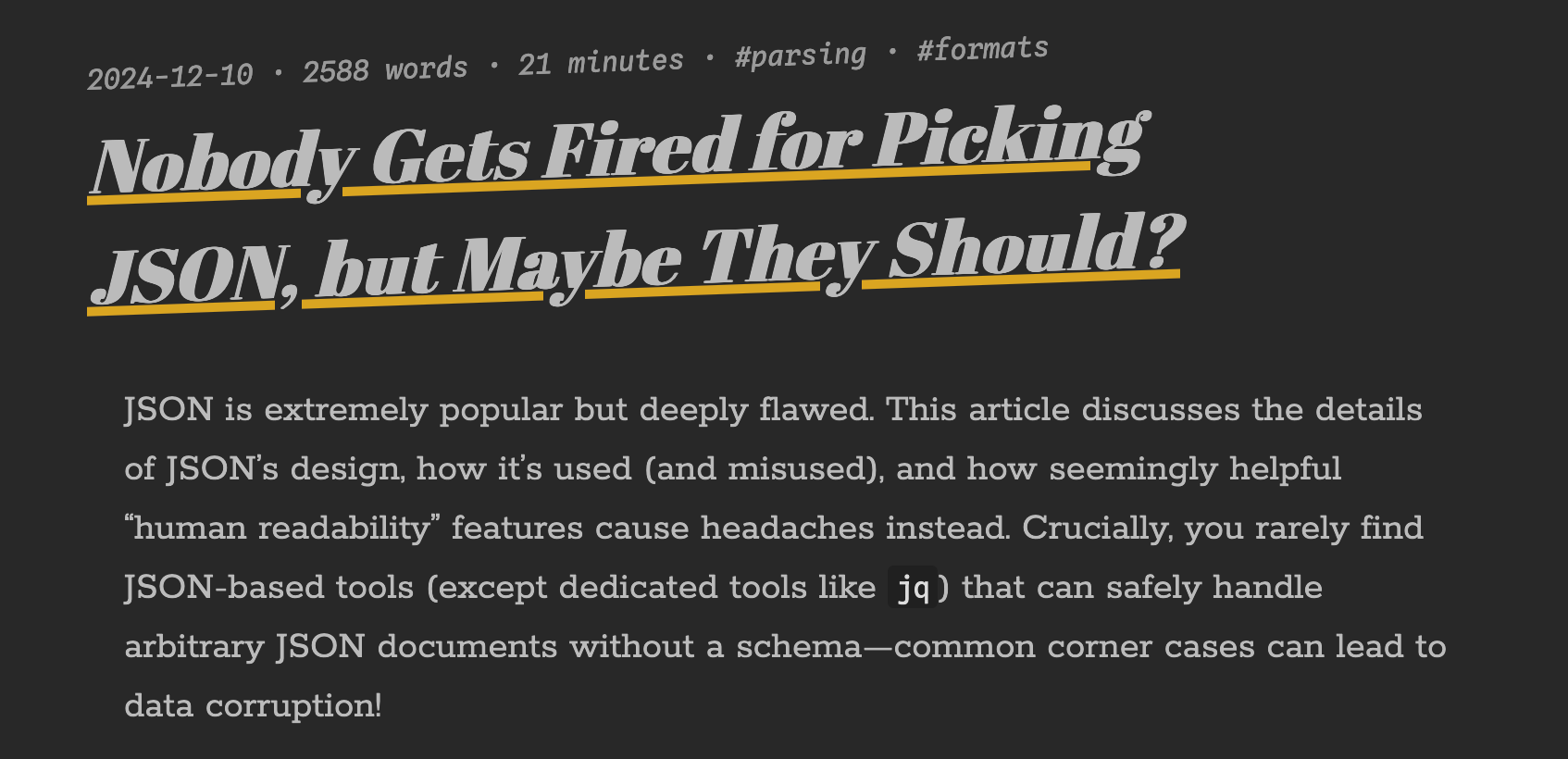 3 â Nobody gets fired for picking JSON, but maybe they should?: who doesn't love JSON? It's simple, and it does the job. But, it seems it also has quite a few flawsâa recent article from Miguel Young highlights some of the fundamental issues of the light-weight data interchange format. He explains, that despite its widespread use in software development today, JSON suffers from serious technical limitations and inconsistencies.