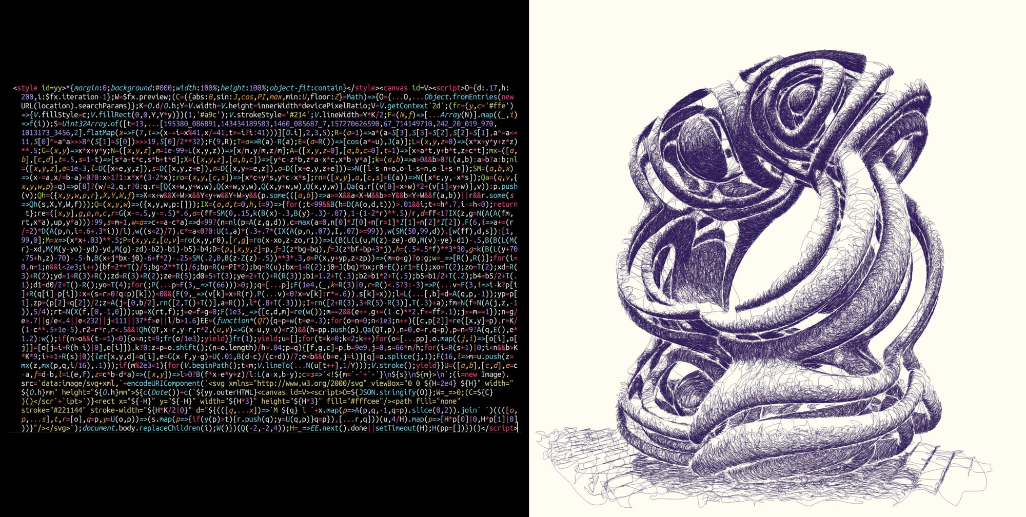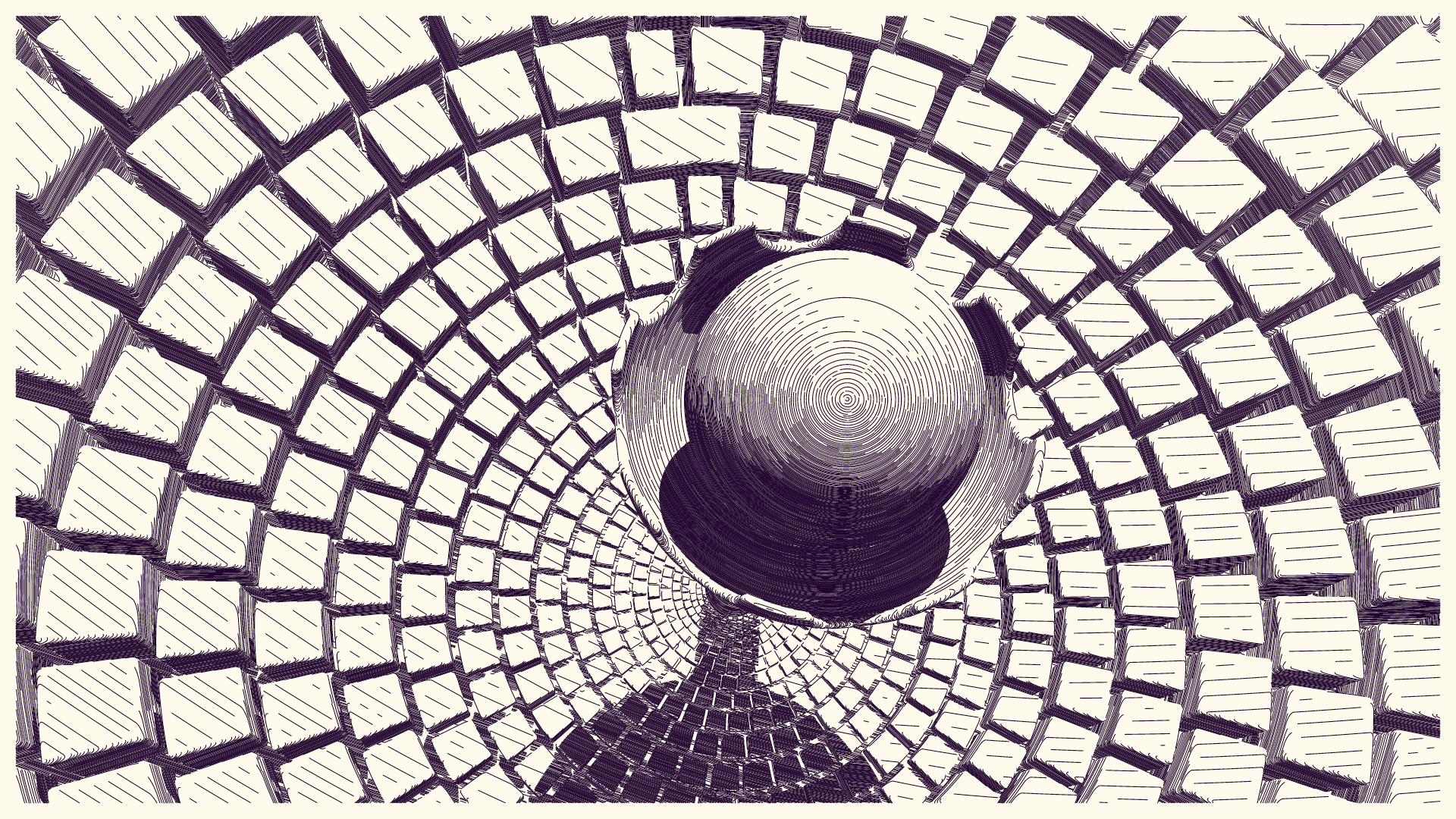 Back in 2022 Piter developed a framework for his project Industrial Devolution, essentially an algorithm that lets him turn 3D scenes (generated by using SDFs) into plottable line drawings in SVG format — he wrote an article about this framework back in 2022, giving it the fitting name "Rayhatcher". Later this same idea evolved into The Universal Rayhatcher, where collectors could input their own SDF formulas that would then be rayhatched; culminated in this large large-scale collaborative artwork, with some really mindblowing outputs.