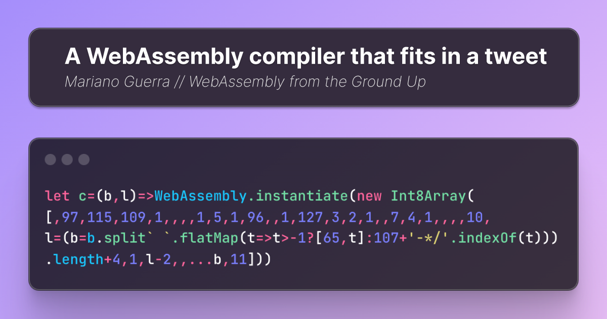 1 — WASM Compiler that fits in a Tweet: my favorite find this week is this article about creating a WebAssembly compiler in just 269 bytes — code so short it fits in a Tweet! If you're not familiar with WebAssembly (WASM), it's a portable binary format that allows running compiled code, from languages like C, C++, Rust, and others, in web browsers — a WASM compiler translates this compiled code into a binary format that can be run in the browser.