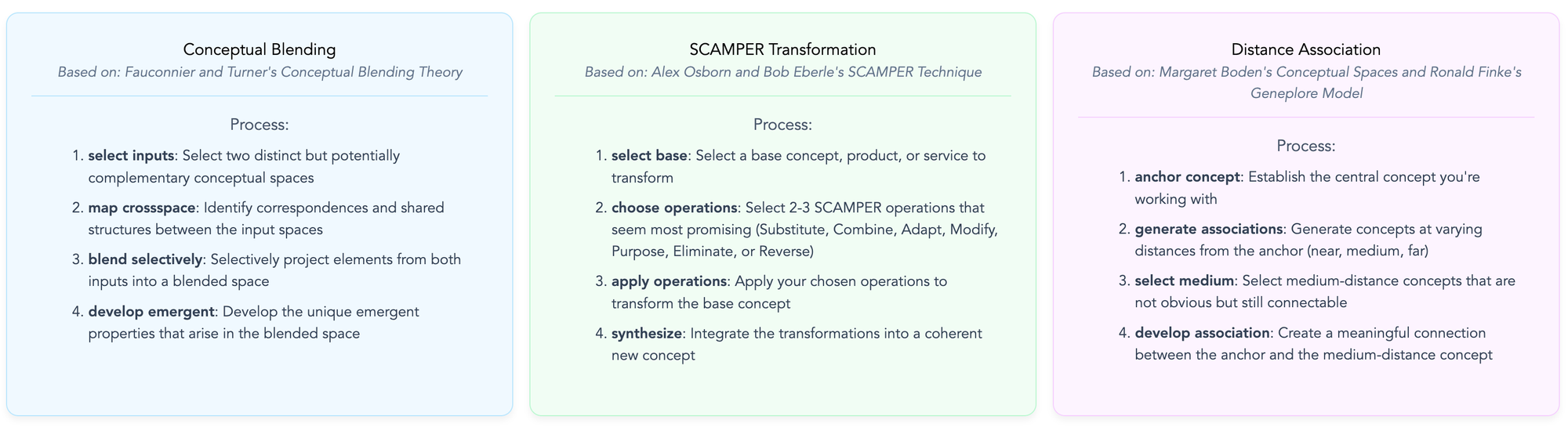 Starting from an initial sample population generated by the LLM, the evolutionary step is guided by a "creative thinking" strategy, that are essentially different kinds of methods for combining and blending samples of the population. These strategies are inspired by the creative approaches from known theorists and creatives.