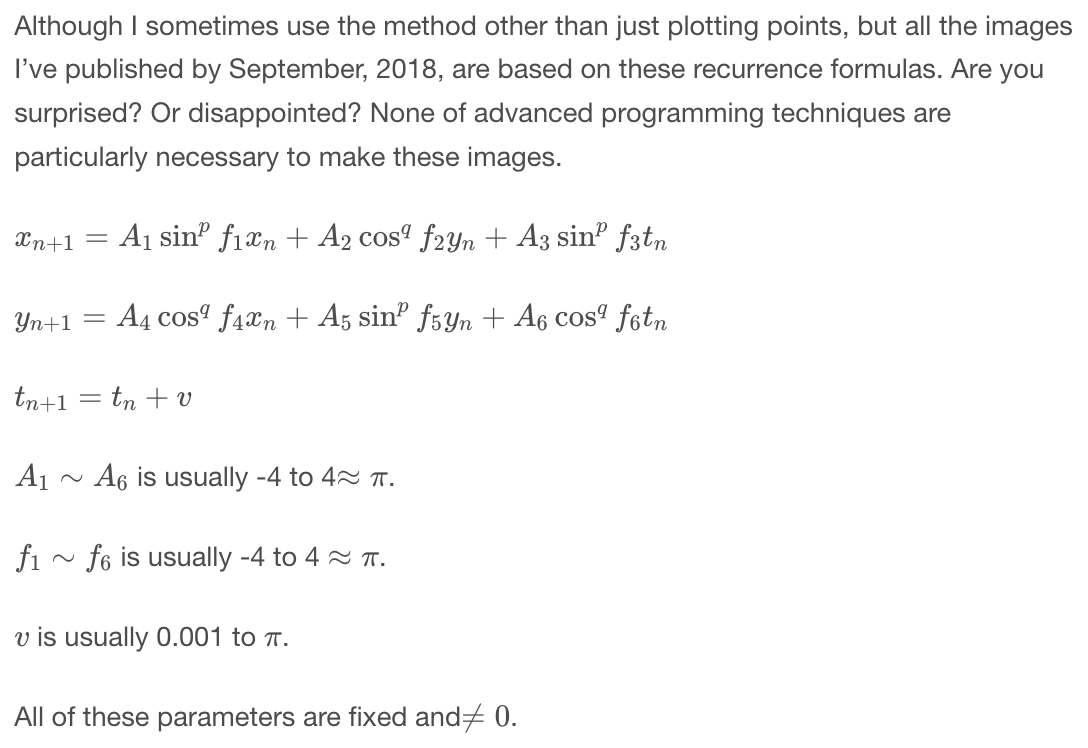 Their work is in part inspired by Masaru Fujii, an artist that doesn't claim to be a generative artist but still leverages trigonometric functions for the purpose of creating mesmerizing algorithmic compositions — I discovered a page where he has actually explained a little bit about his method and how it's simply based on combinations of sinusoids.
