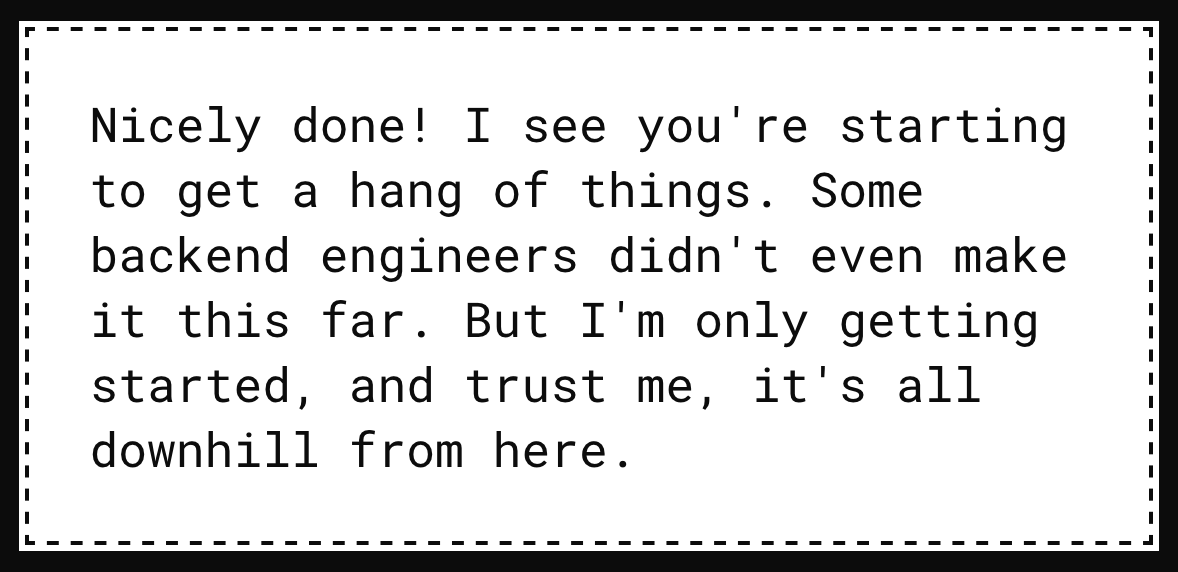 A big highlight for me were the short congratulation messages that Marcos threw in, in between the challenges — shots fired a backend devs: