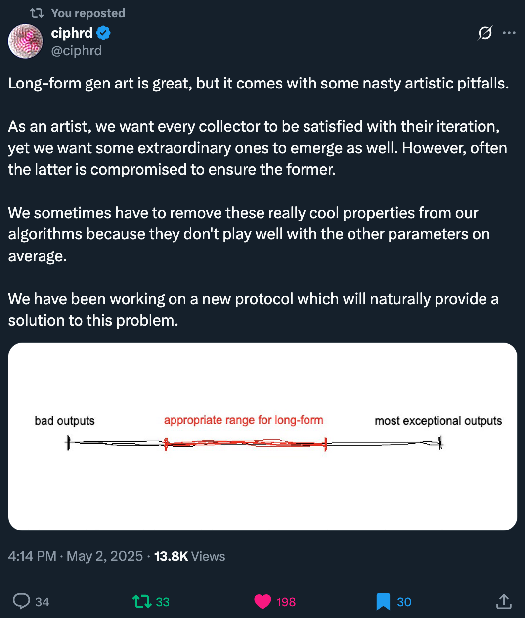 While long-form genart was new and exciting for a period of time, things have come to a crawling stop in the past months. It's become more and more evident that there's quite a few shortcomings to the long-form paradigm, particularly in how it constrains both artists and collectors.