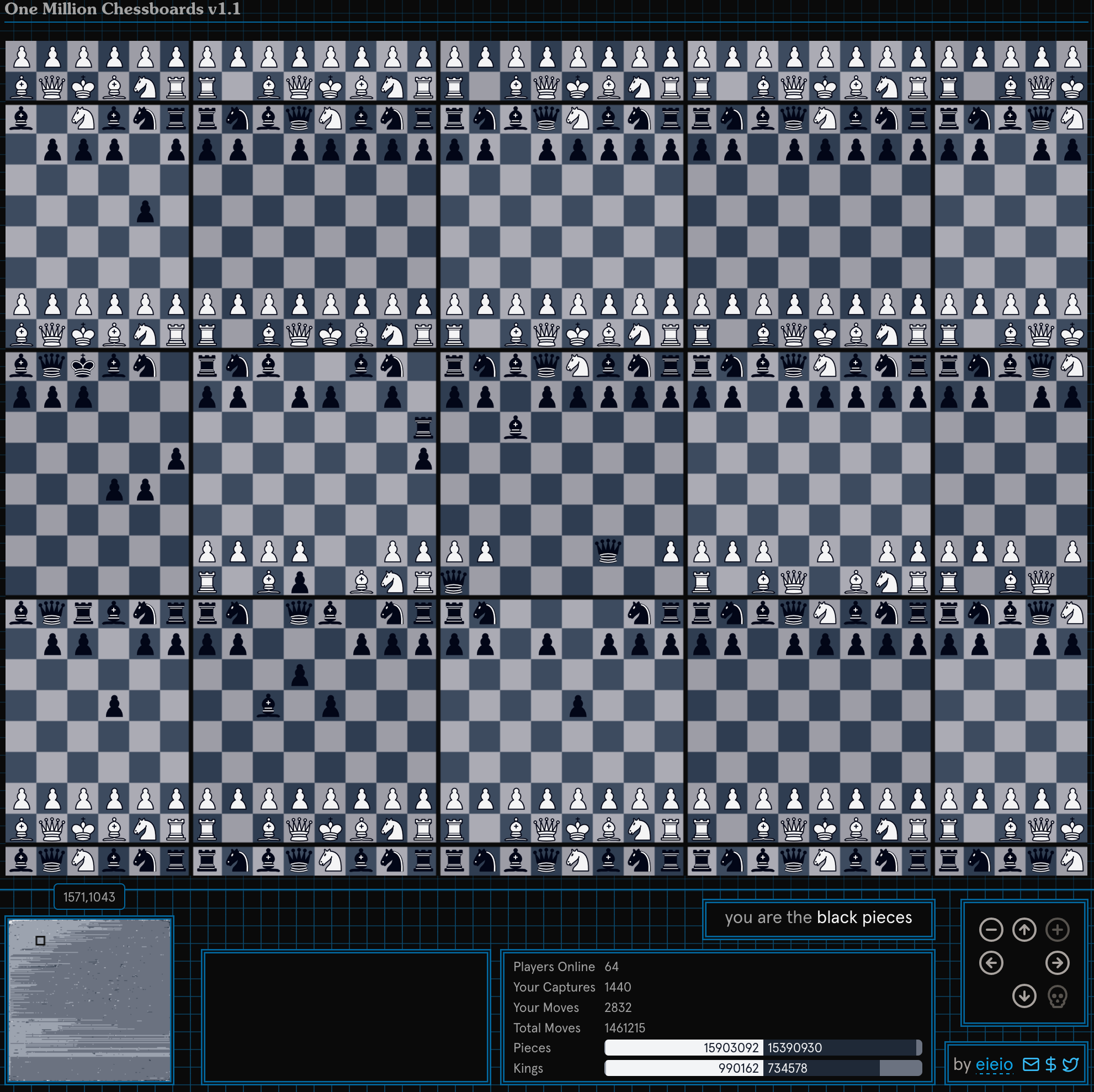 1 — One Million Chessboards: Nolen Royalty is back with another experiment that disregards absolutely any considerations for the general scale of things on the web — one million chessboards is a chess MMO, where players can move the pieces of one million chessboards simultaneously — try it out for yourself here: