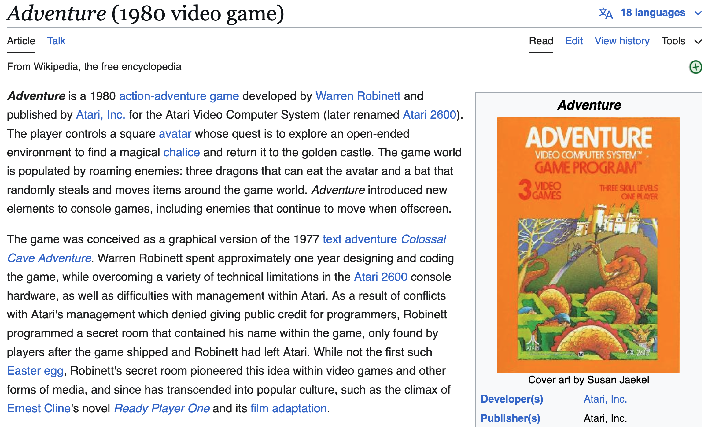 4 — Inventing the Adventure Game: this week's wildcard is "an unpublished book manuscript from the dawn of the video-game age (written in 1983-84)." by Warren Robbinet. The book documents early video game history, particularly the 1980 game Adventure.
