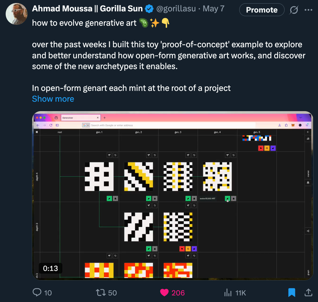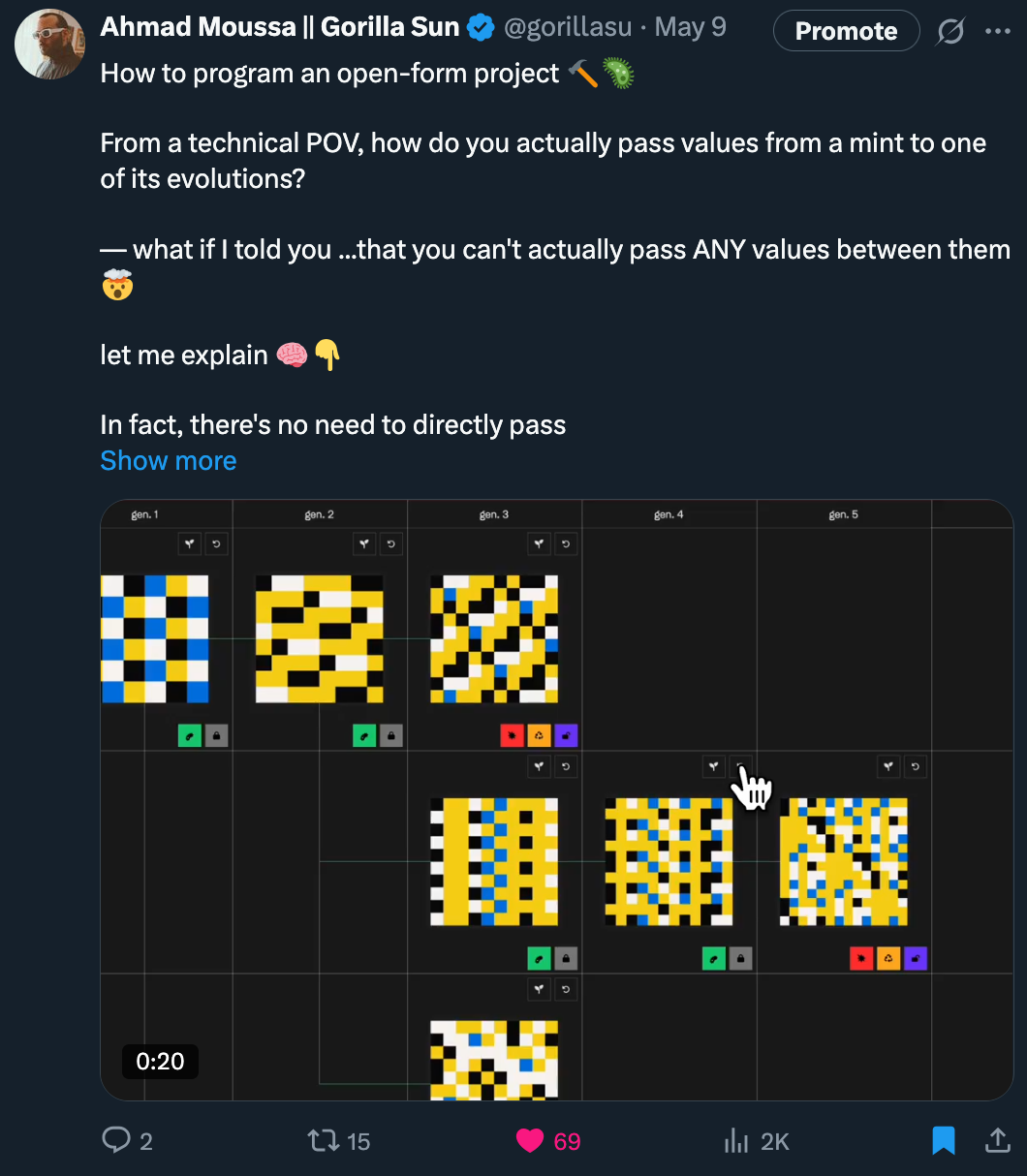 Collected editions from an open-form project can now also act as their own mini-generators that spawn new child mints. We call this evolving a mint, because it now becomes possible to transfer information between a parent and a child mint! Naturally, this is entirely up to the artist on how they leverage this aspect of open-form genart—and from my early tests I believe there's really a lot that can be done.