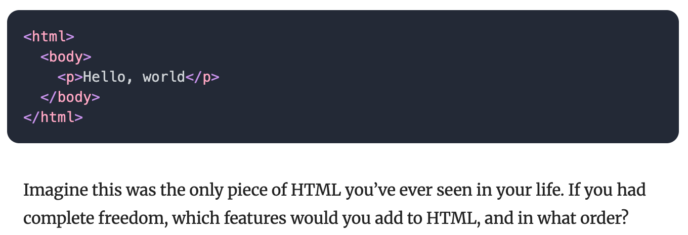 5 — Functional HTML: if you could add an HTML tag of your choice, what would it be? Dan Abramov reimagines what it would be like if HTML behaved more like a full fledged functional and composable programming language—in essence Dan reinvents React Server Components and how they can be understood as a natural evolution of HTML that addresses fundamental web development challenges.