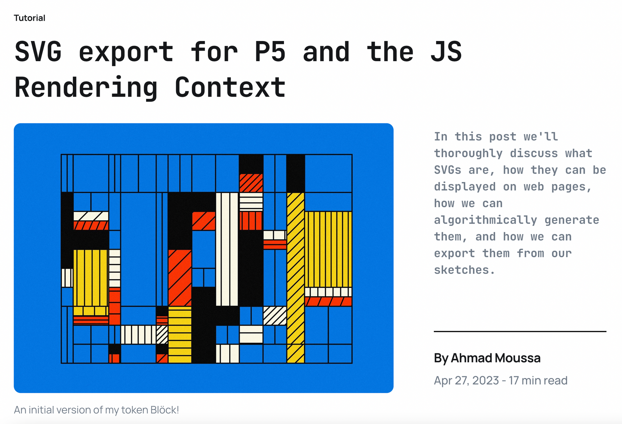 Reading interviews of other generative artists makes me feel incredibly inspired, and I immediately want to get back to working on my own pieces. I haven't been making as much art as I would've liked to in the past weeks since I've been focusing more on the blog and getting it up to speed. I'm very happy with it now though. There's only a couple more things on my list that need to be done and then I'll dedicate myself to making art again. 🤞