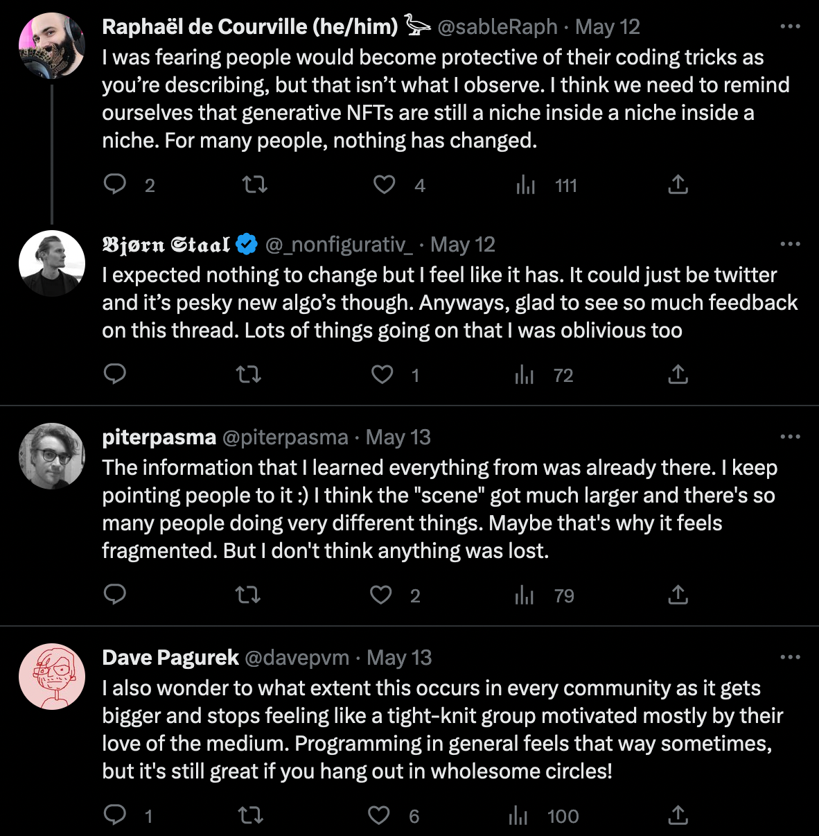 One thing I miss from the #genart scene pre-NFT's was how much more knowledge, techniques and code was shared. Since there was nothing to gain (financially) people had less to loose. I think we can choose to keep this very valuable part of the culture alive for the benefit of all