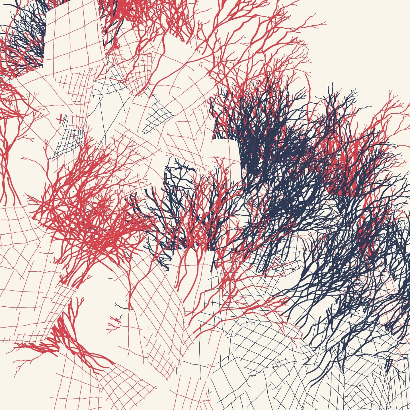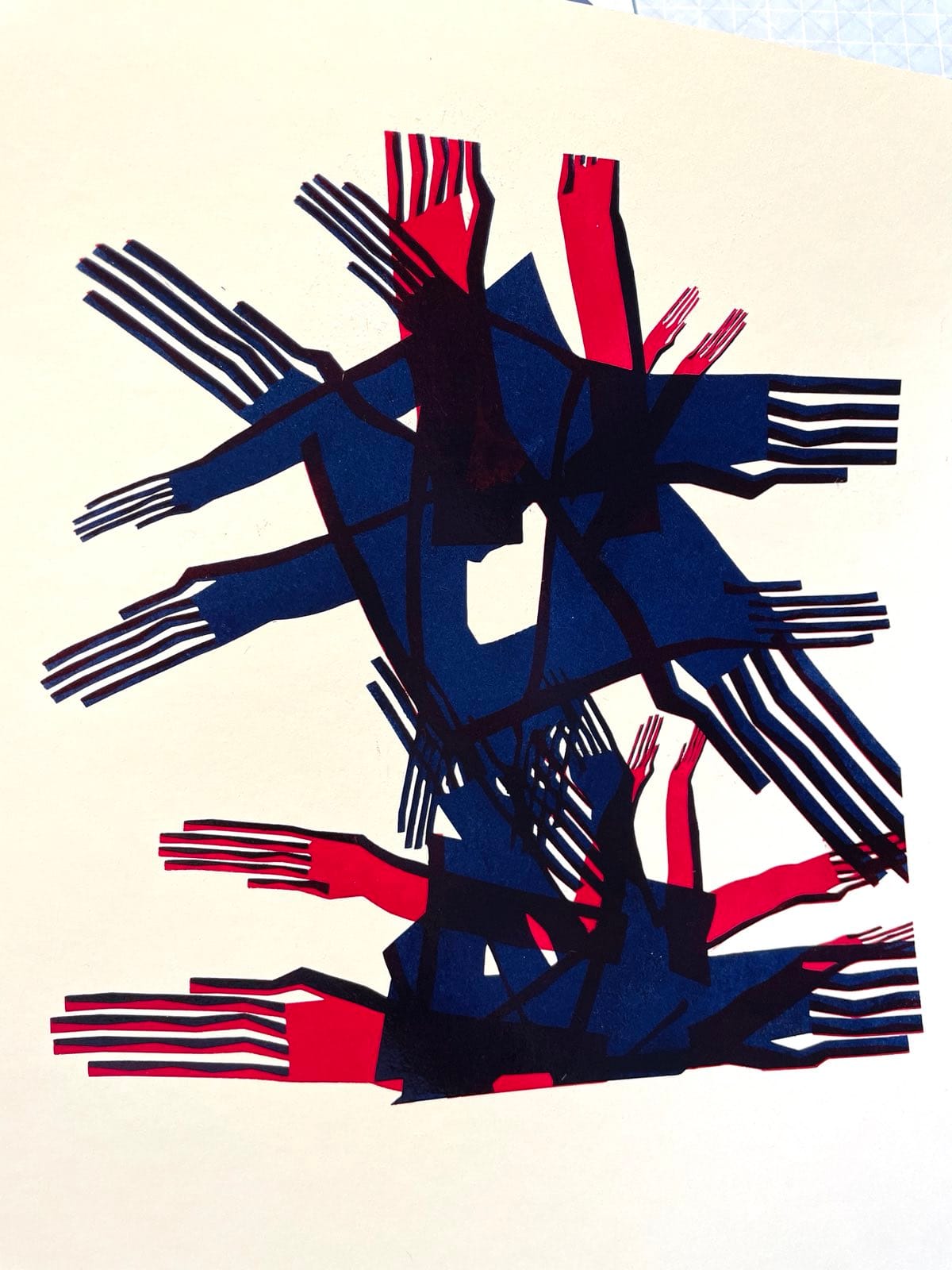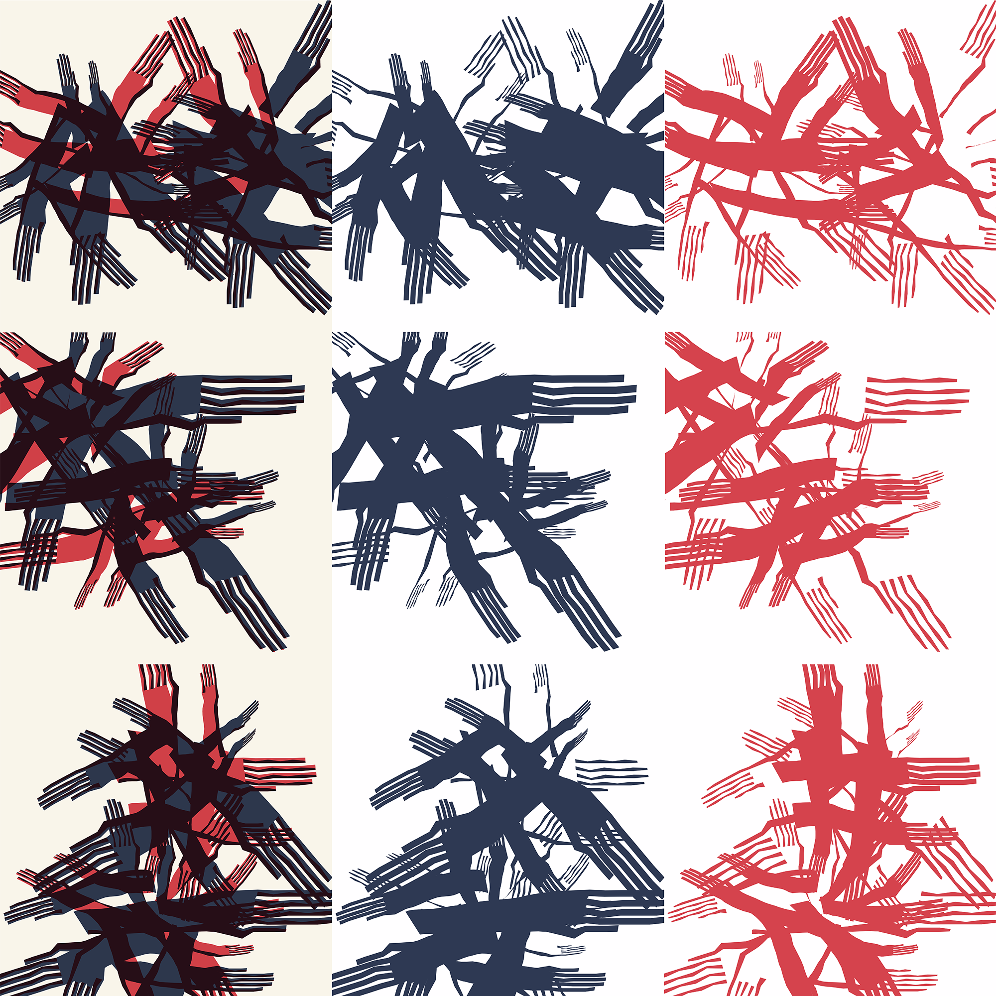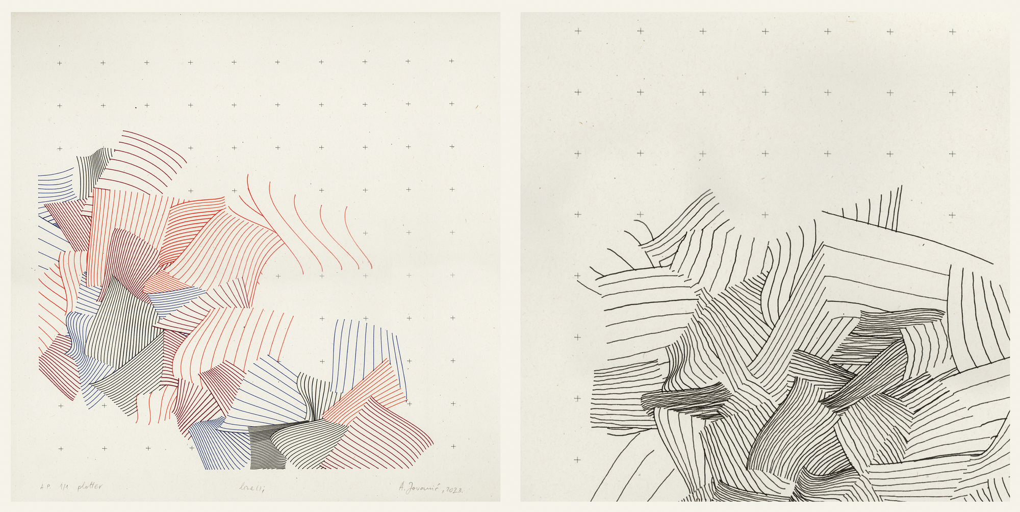 A recent example are the red and blue linocuts that I experimented with. I had to split the code, not by objects, but by color. I wanted to combine two colors and get the third in overprint, so I had to figure out the code for it - sort of the other way around. Sometimes I'm not satisfied with the final outcomes on paper, but the outcomes from the code gave me inspiration for further experiments.