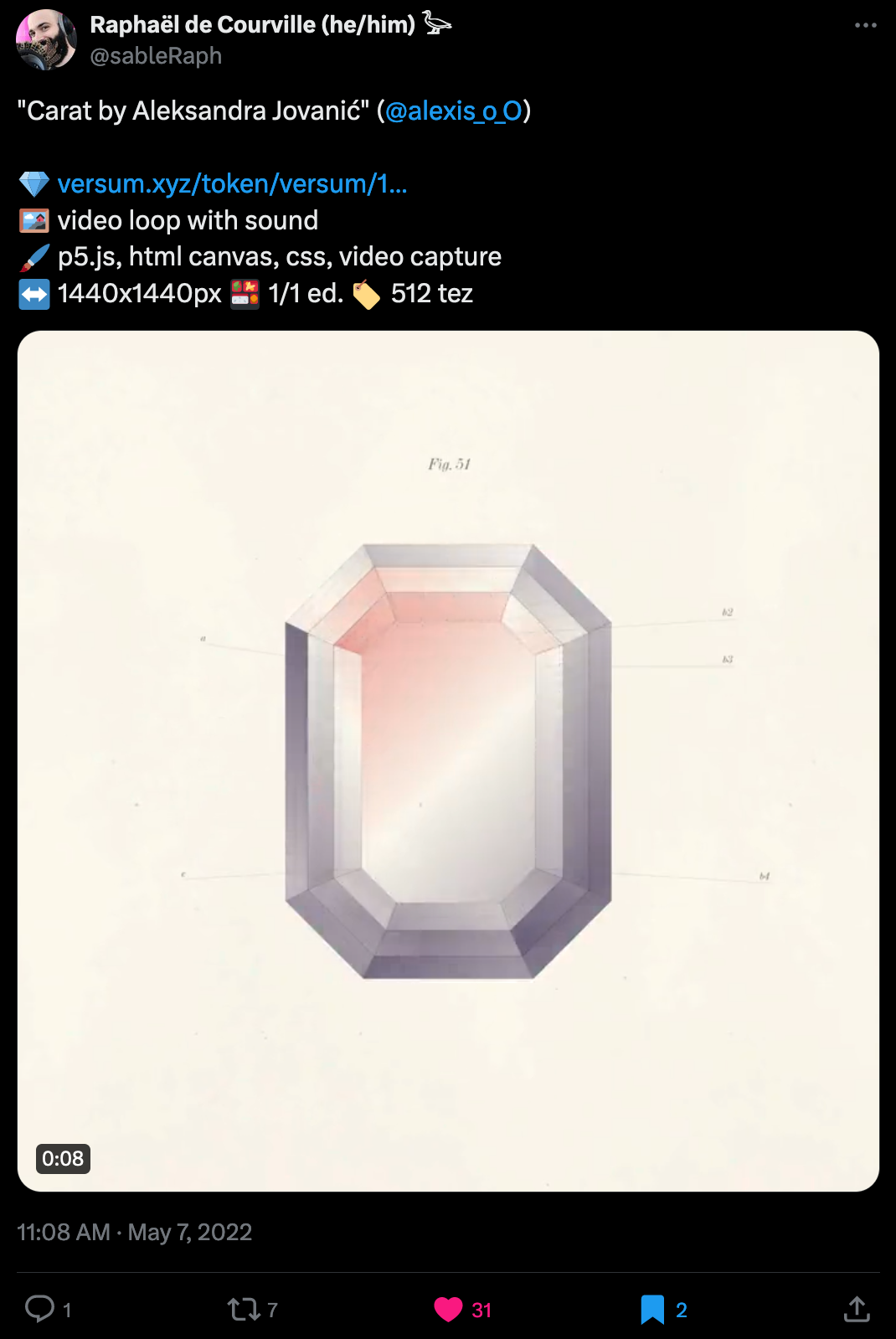 Link to Tweet | Originally minted on Versum, that no longer exists today, the project can be found over on Objkt.com. It is still mintable as of today.