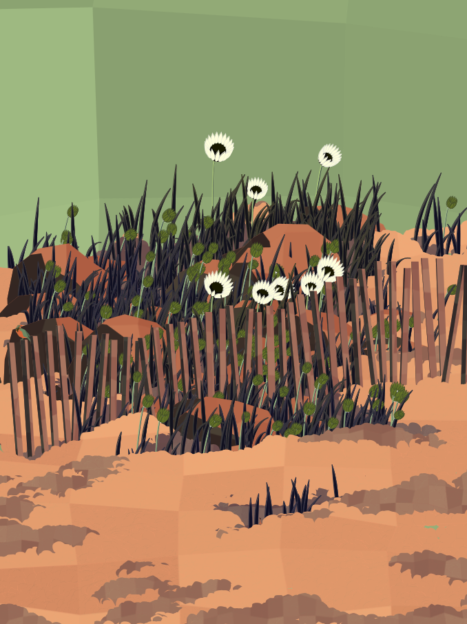 On Frontier it was really fun to see how much I had learned, in comparison to my first one. I think it's the one that I'm the most proud of. One thing that didn't make it into the final project, was mouse interaction that allowed you to move things around. What's cool is the wind parameter that affects the placement of the items.