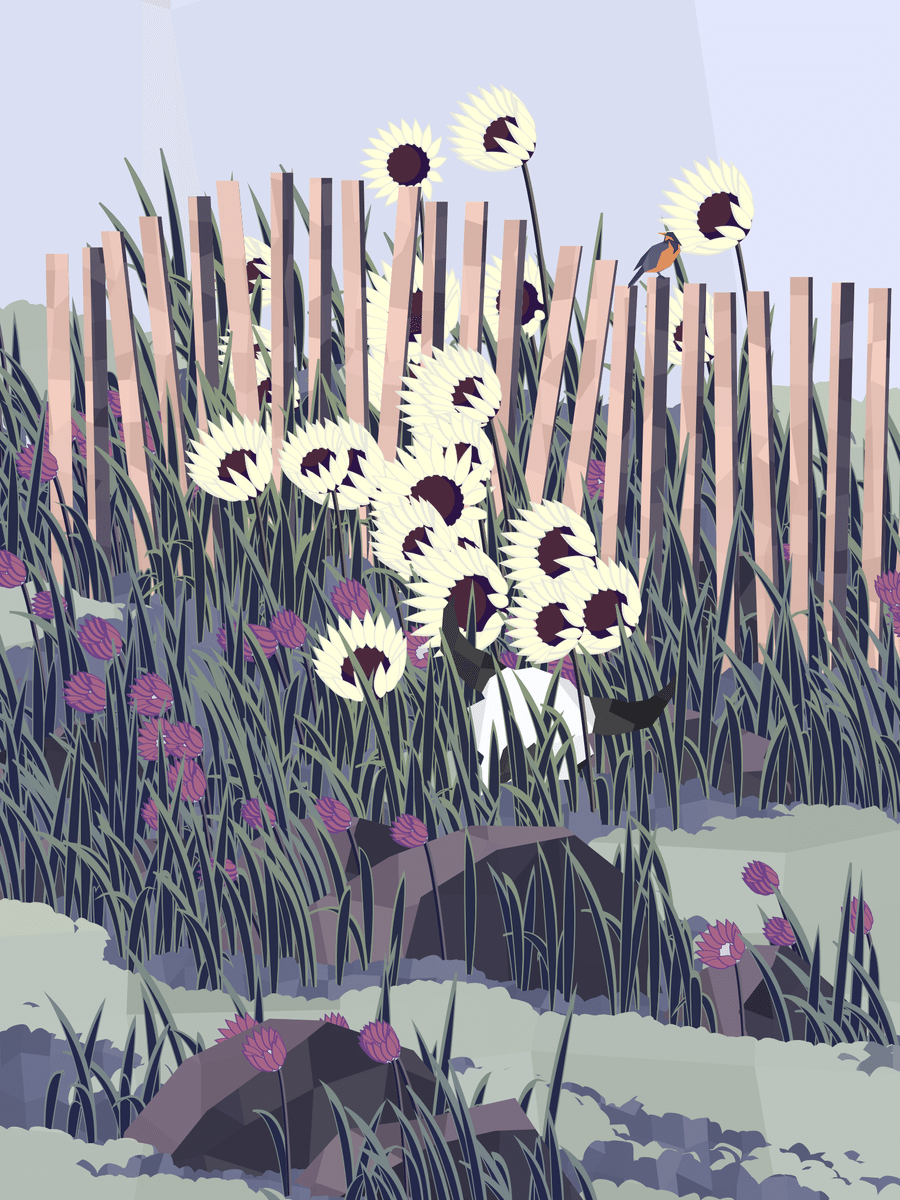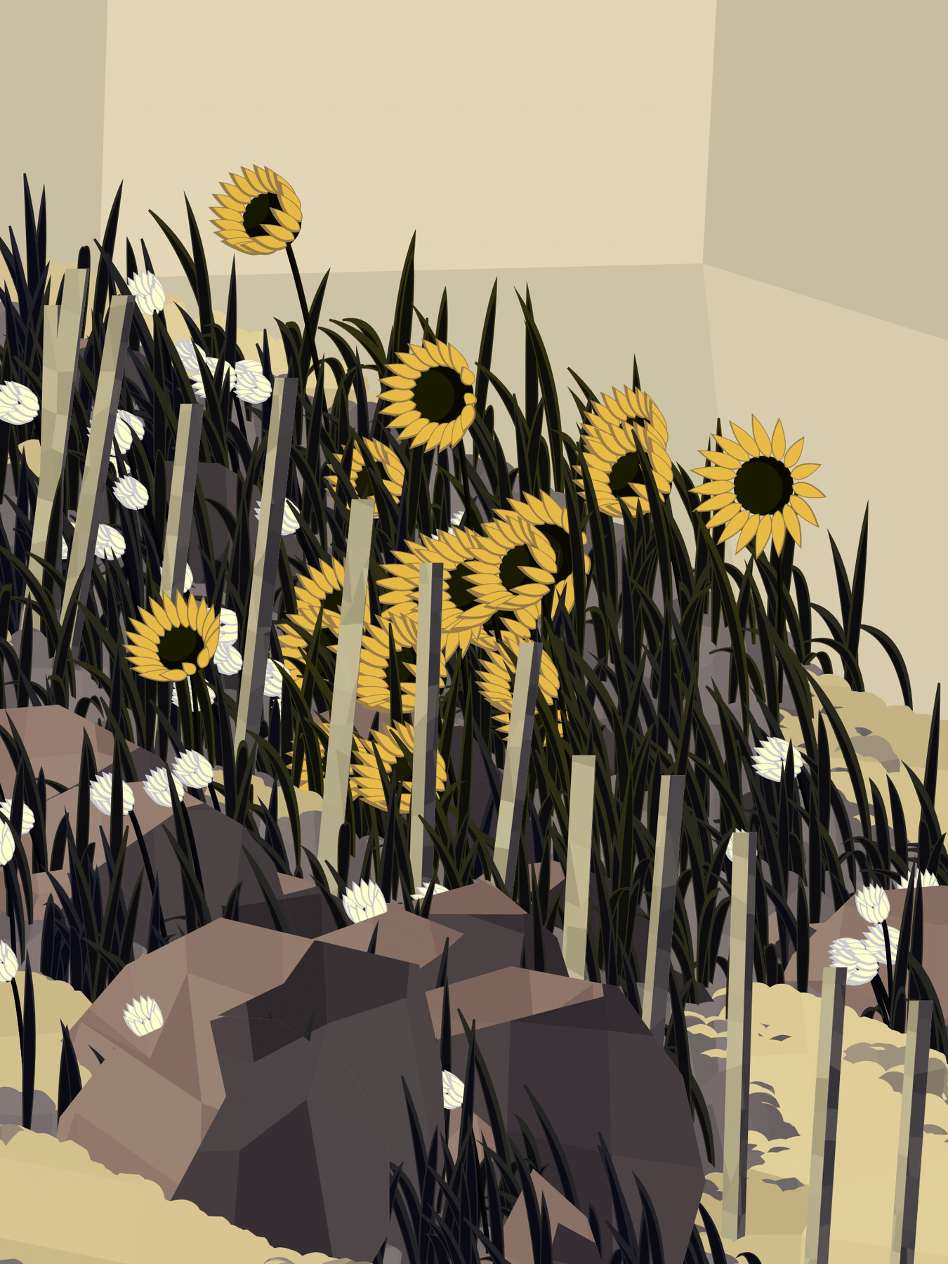 That's what made me ditch the outlines and simply make use of flat shading with high contrast colors. I found the juxtaposition of this highly geometric style within the context a natural scenes really interesting.