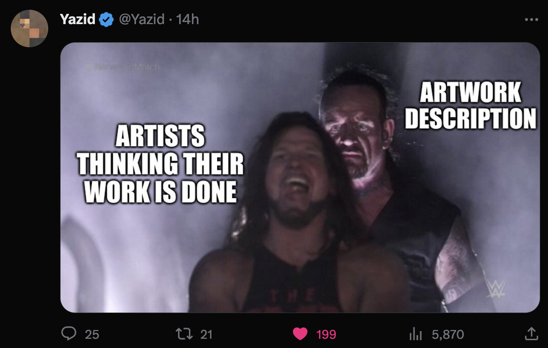 Gorilla: I feel the same way. Whenever I finish a project and I get to the point of minting it on the blockchain, I end up finding myself in front of that description box - asking me to say something about my piece. It always feels like "Okay, now I have to make up something about how I got inspired and stuff". Sometimes it feels a little bit like I'm lying.