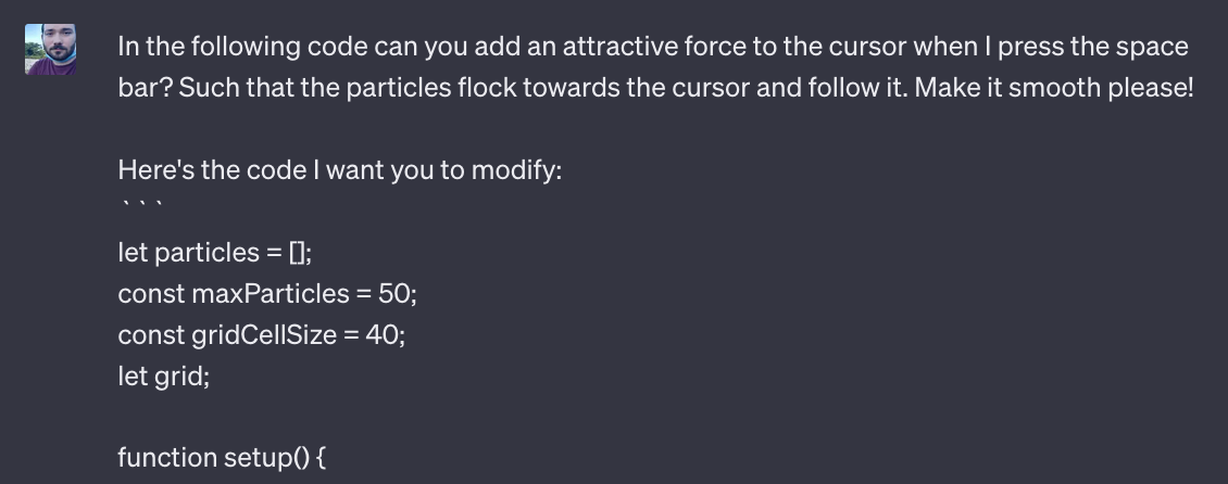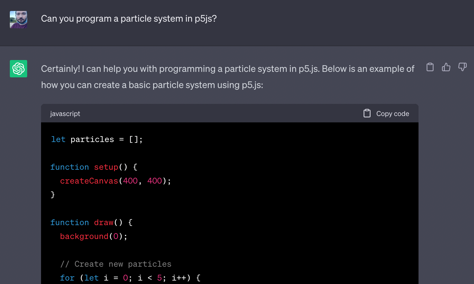 If you haven't been living under a rock then you've probably heard about ChatGPT. What's more is that the large language model is also capable of generating code. This post is about using the AI chat-bot to develop a particle system in P5JS, and test if it's capable of making adjustments to a simple sketch based on our prompt inputs.