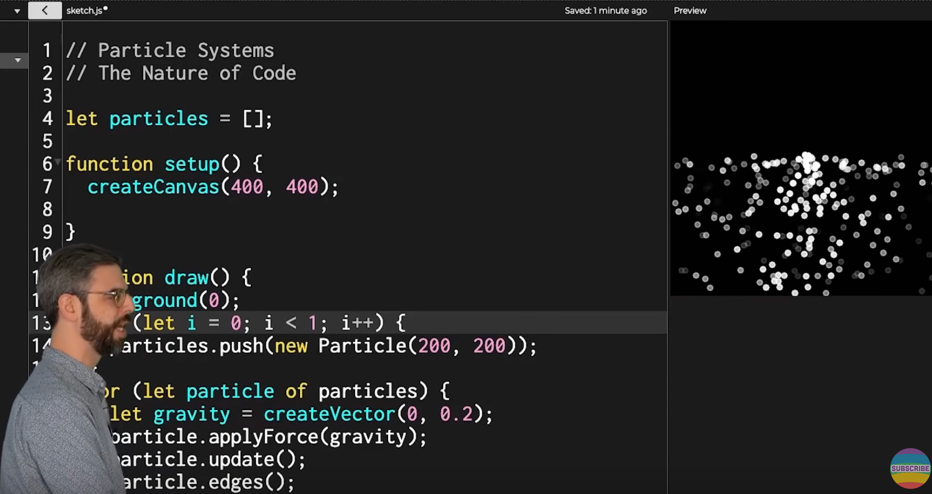 You might notice here that the particles sink through the bottom of the canvas after they sit there for a bit, let's fix that. I also actually want the oldest particles to disappear and have the mouse continuously spawn new ones.