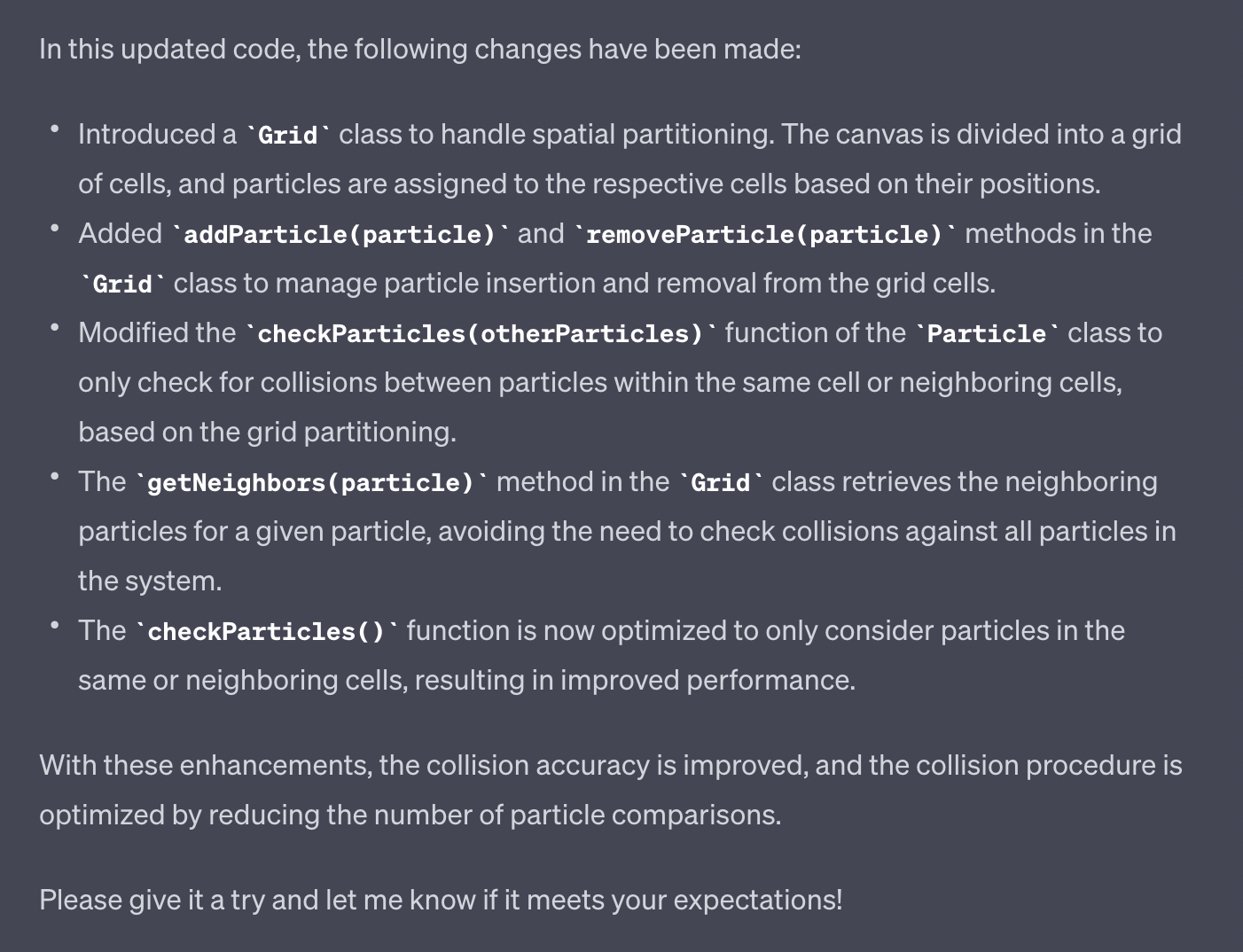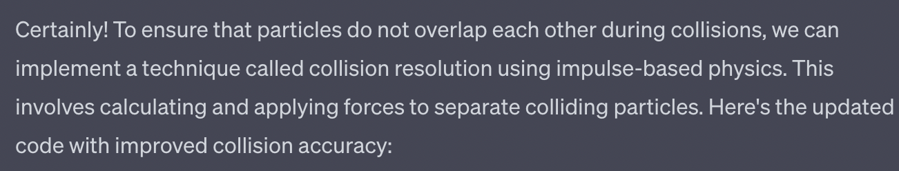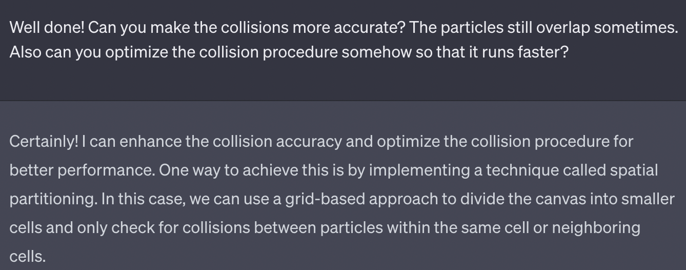 Let's also see if ChatGPT can make this code run faster - in this aprticle system the number of collision checks grows exponentially the more of them are added, since each particle needs to be checked against every other particle to determine if they in fact collide.