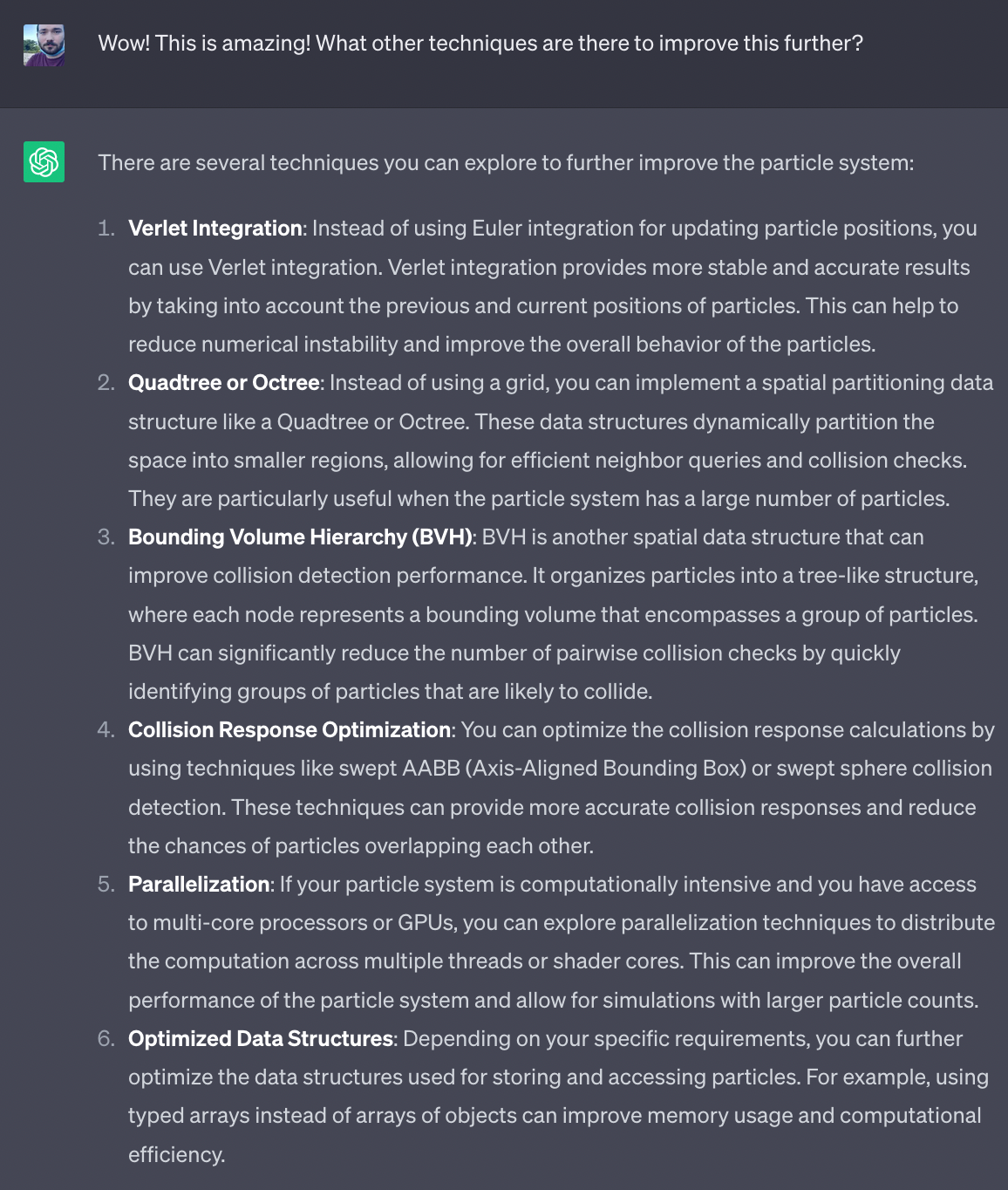 Hope you enjoyed this little experimental post about sketching with ChatGPT! Now I'm actually really excited to write a little tutorial on how to code a Particle System from scratch, with physics and all that Jazz - especially with the grid lookup and the collision resolution method!