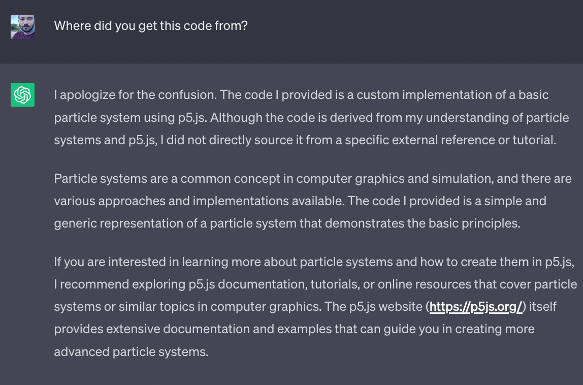 As we're going to see, it turns out that ChatGPT is actually pretty good at making P5JS sketches! Considering that GPT-3.5 was trained on a big chunk of the entire internet, it is likely that it has seen many thousands of P5JS sketches.